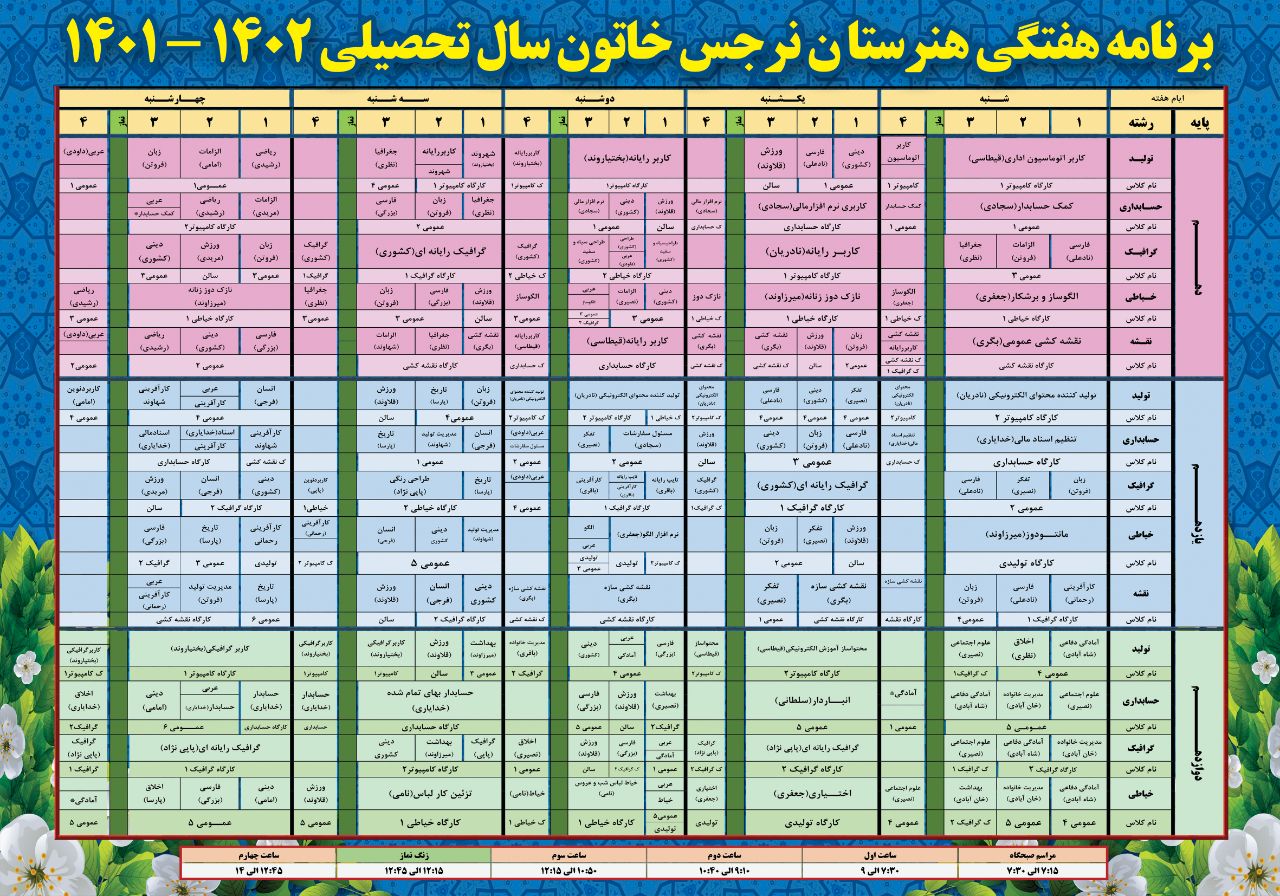 برنامه هفتگی سال تحصیلی ۱۴۰۱/۱۴۰۲ 29 مهر 1401 ارسال شده توسط زینب امیدی برنامه هفتگی برچسب ها: برنامه هفتگی،هنرستان نرجس خاتون،اندیمشک،کاردانش